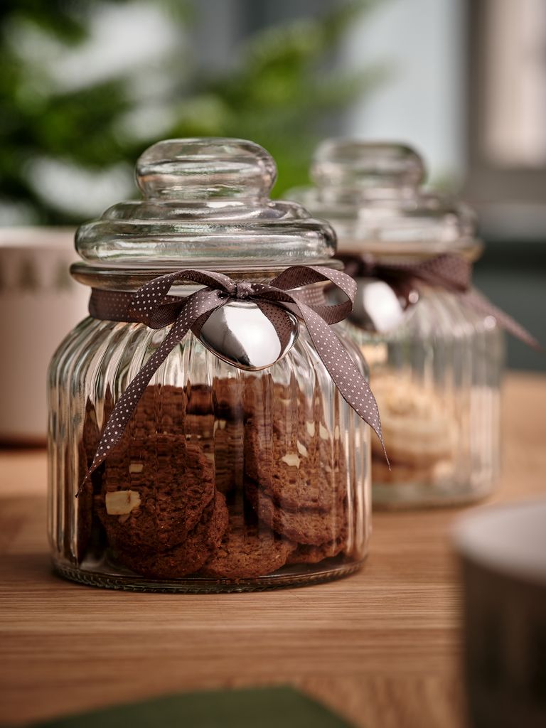 Prozorna steklena posoda z okrasno pentljo in srčkom. Odlična za shranjevanje božičnih dobrot, kot so oreščki in sladkarije. Ø11xV14,5 cm