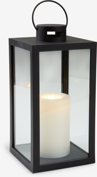 Laterna v klasičnem črnem dizajnu. Ima LED lučko, ki ustvarja toplo in prijetno vzdušje. Opremljena je s praktično funkcijo časovnika, s katero je 8 ur vklopljena in 16 ur izklopljena. Potrebuje 3 baterije AA (niso priložene). Š13xD13xV26 cm