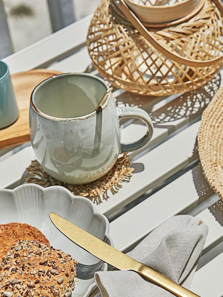 Bež skodelica z ročajem, izdelana iz keramike. S kapaciteto 40 cl je idealna za veliko skodelico kave ali čaja. Primerna za pomivanje v pomivalnem stroju. Ø10xV10 cm