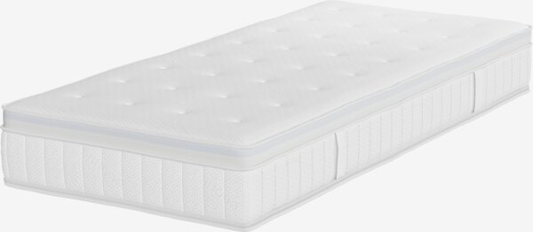 Vzmetnica 90x200 cm z multi žepkastimi vzmetmi (520/m²), razdeljenimi na 7 con udobja, ki zagotavljajo edinstveno, ergonomsko pravilno oporo. Vzmetnica je podložena s hladno in poliuretansko peno. Prevleka vsebuje na eni strani hladilni polietilen, ki zagotavlja takojšen, pomirjujoč občutek. Prevleka je gosto prešita s spominsko peno, ki lajša pritisk. Višina: 28 cm.