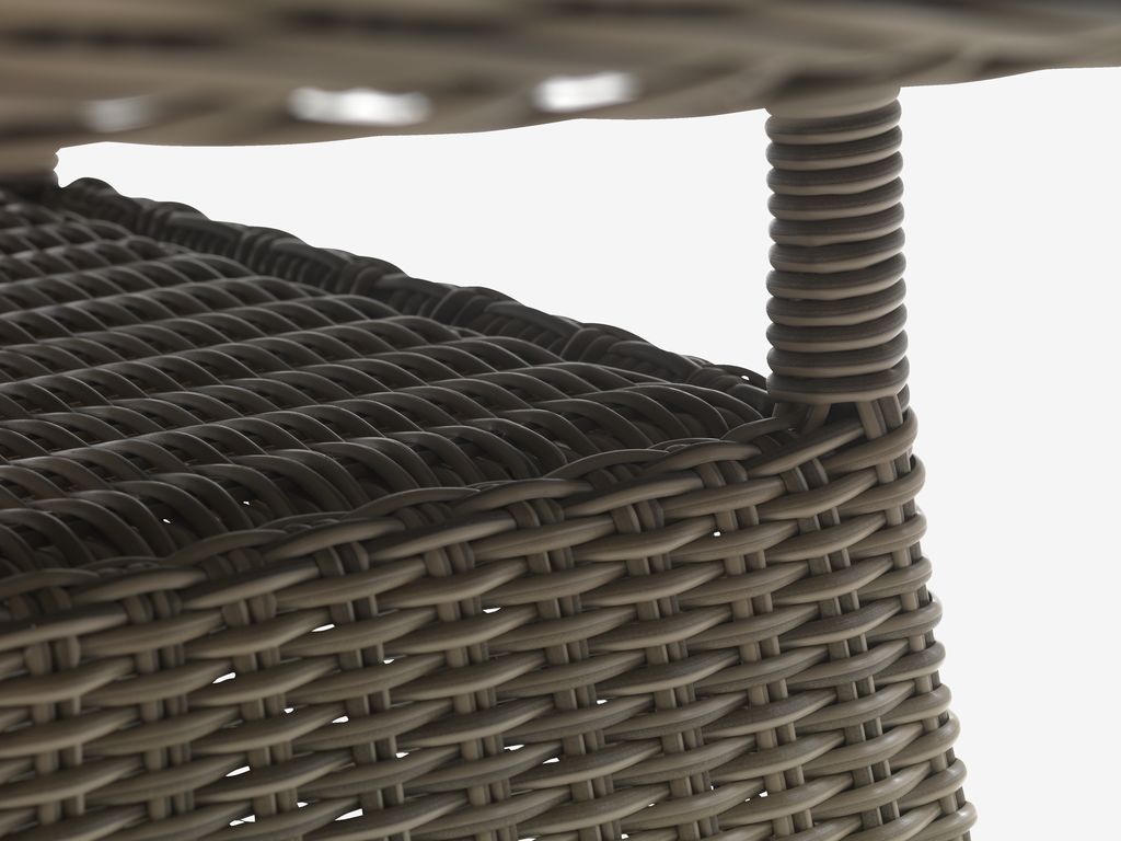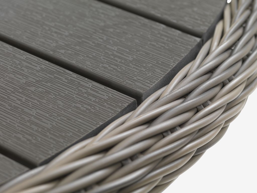 Okrogla vrtna miza s sivo mizno ploščo iz umetnega lesa. Ujemajoč se okvir in noge iz umetnega ratana in prašno lakiranega aluminija. Polica pod mizno ploščo je idealna za shranjevanje manjših predmetov, kot so revije in pogrinjki. Umetni les ima videz in teksturo naravnega lesa brez potrebe po vzdrževanju. Aluminij je lahek in robusten material, ki ne rjavi. Ø130xV74 cm