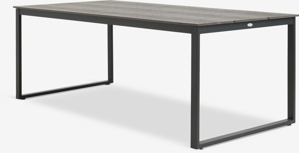 Vrtna miza s temno rjavo mizno ploščo iz umetnega lesa. Črn okvir iz aluminija in noge iz prašno lakiranega jekla. Umetni les ima videz in teksturo naravnega lesa brez potrebe po vzdrževanju. Aluminij je lahek in robusten material, ki ne rjavi. Š100xD210xV74 cm