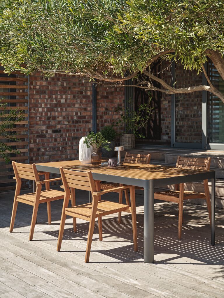 Vrtna garnitura za 4 osebe. Miza: Aluminij in oljen FSC® trdi les. Š91xD211xV75 cm. Stol: Oljen FSC® trdi les. Nakladljiv.
