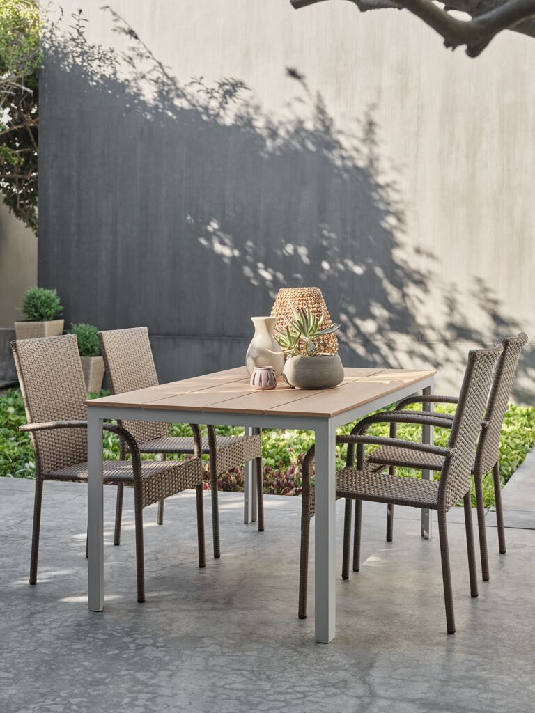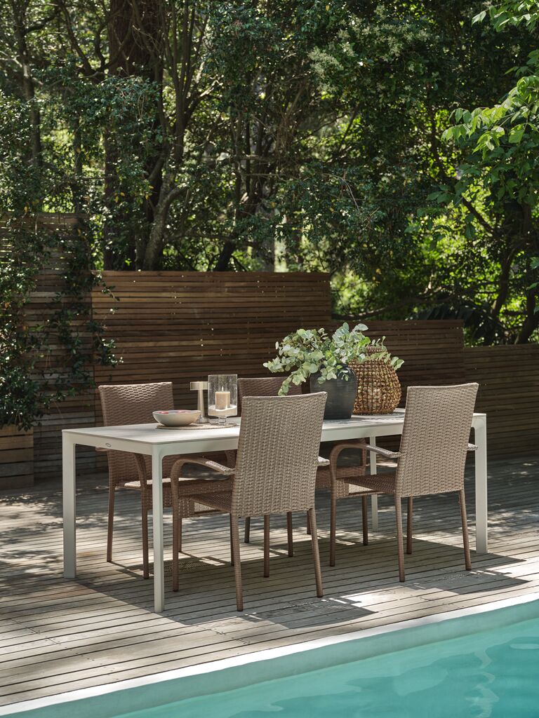 Nakladljiv stol iz umetnega ratana z okvirjem iz prašno lakiranega jekla. Umetni ratan zagotavlja naraven videz protja, hkrati pa je odporen na vremenske vplive in ne zahteva vzdrževanja. Vrtni stol je nakladljiv za kompaktno shranjevanje.
